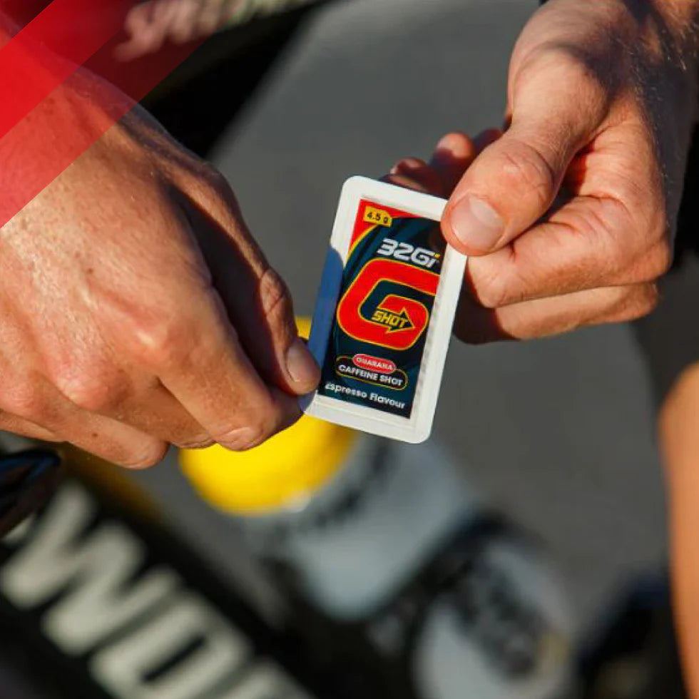 The 32Gi® G-Shot is designed with the you, the athlete, in mind. Separate your caffeine from your carbs, and you control how much, and when, to take. A 60 mg shot of pure liquid guarana caffeine delivered via a 4.5 g gel to replicates the potency, taste and effect of a real-life espresso coffee shot.